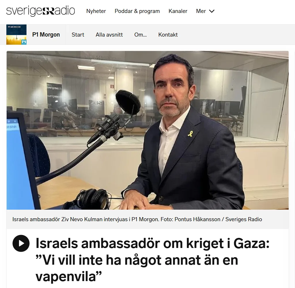 Sedan Hamas attack mot Israel i oktober 2023 har konflikten i Gaza krävt tiotusentals liv och lett till en alltmer akut humanitär kris. Samtidigt pågår nya försök att nå fram till ett avtal om vapenvila. I P1 Morgon intervjuas Israels ambassadör i Sverige, Ziv Nevo Kulman, om vad som krävs för att få ett slut på kriget, hur Israel ser på den allvarliga situationen i Gaza – och om anklagelserna om folkmord.